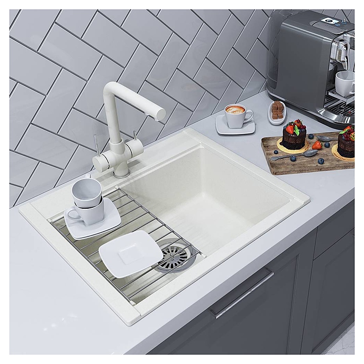 Кухонная мойка AQUATON Делия 1A715232LD240 выполнена в современном минималистичном стиле. Модель оснащена одной увеличенной глубокой чашей, в которой можно помыть сковородки, кастрюли, противни и другую посуду любого размера. Оборачиваемость мойки позволяет при установке выбрать расположение крыла слева или справа. Корзинчатый вентиль, расположенный в сливном отверстии, выполняет функцию фильтра. Изделие выполнено из литого мрамора, обладающего высокими бактерицидными свойствами и устойчив к резким перепадам температур. Комплектация: