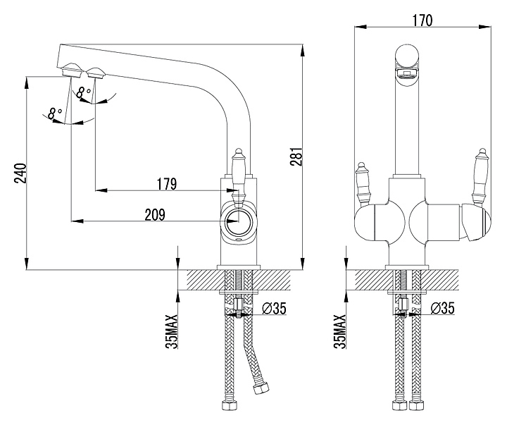Смеситель LEMARK Villa LM4861B предназначен для использования в кухонных помещениях для подачи горячей и холодной воды. Серия Villa выполнена в стиле ретро. Модель оснащена керамическим картриджем, обеспечивающим плавный ход рычага смесителя, контроль и точность при выборе напора и температуры воды, а также керамической кран-буксой для крана с питьевой водой. Изделие выполнено из высококачественной латуни, отличающейся прочностью, долговечностью и устойчивостью к перепадам температур. В комплект поставки входят крепления, переходник для подключения шланга от фильтра с питьевой водой, гибкая подводка и аэратор. Особенности: