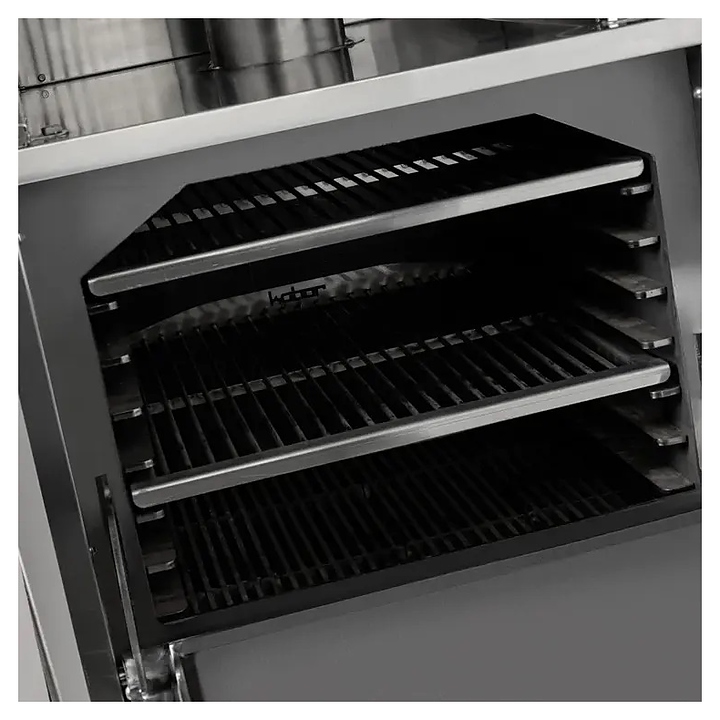 Печь-мангал Кобор FIRE-45-L BC предназначена для приготовления блюд на углях на предприятиях общественного питания. Модель оснащена подставкой и полкой для подогрева. Корпус выполнен из нержавеющей стали AISI430, камера и колосниковая решетка - из жаростойкой котловой стали толщиной 5 мм, дверь и некоторые элементы имеют черное полимерное покрытие. Особенности: