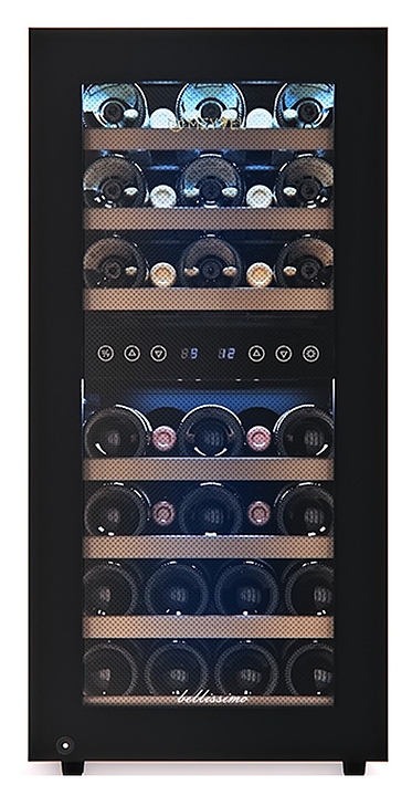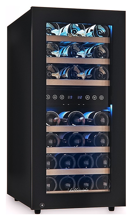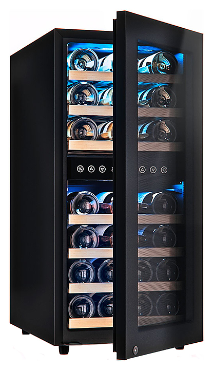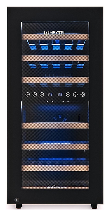Винный шкаф MEYVEL MV33-KBF2 предназначен для демонстрации, хранения и создания оптимальных условий для сохранения всех вкусовых свойств вина в бутылках на предприятиях общественного питания, торговли, в барах, ресторанах, специализированных магазинах, частных домах или квартирах. Модель оснащена сенсорной панелью управления, электронным термостатом и светодиодной подсветкой синего цвета в каждой зоне. Корпус выполнен из окрашенной в черный цвет стали, дверь - из пластиковой рамы и тонированного стекла с защитой от ультрафиолетовых лучей, полки - из массива бука. Особенности: