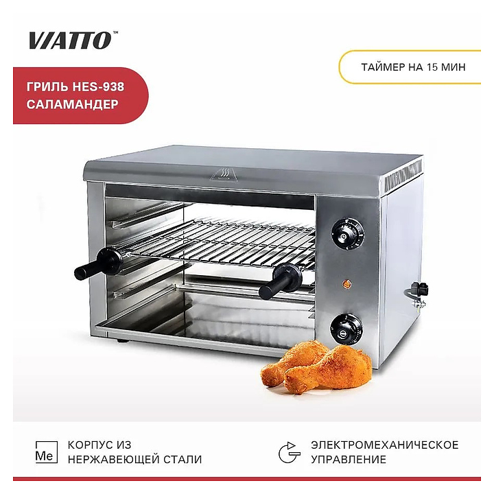 Гриль Salamander VIATTO HES-938 предназначен для жарки мяса, птицы, рыбы, овощей и быстрого разогрева полуфабрикатов на предприятиях общественного питания и торговли. Модель оснащена таймером. Дополнительные характеристики:
