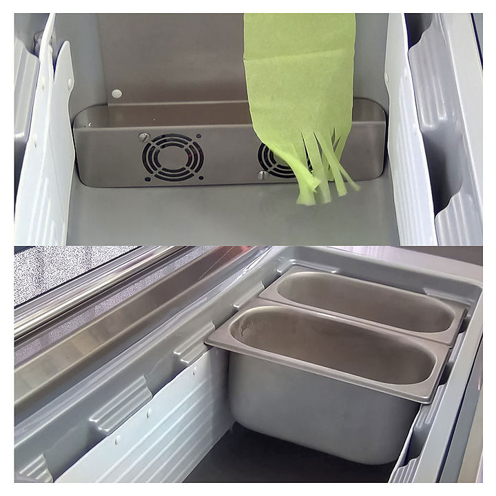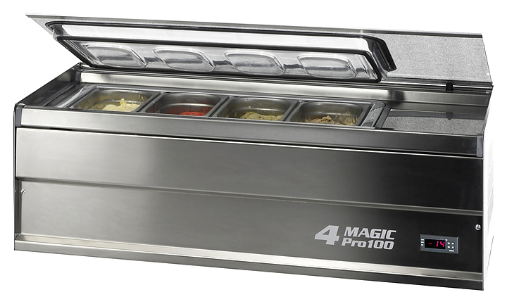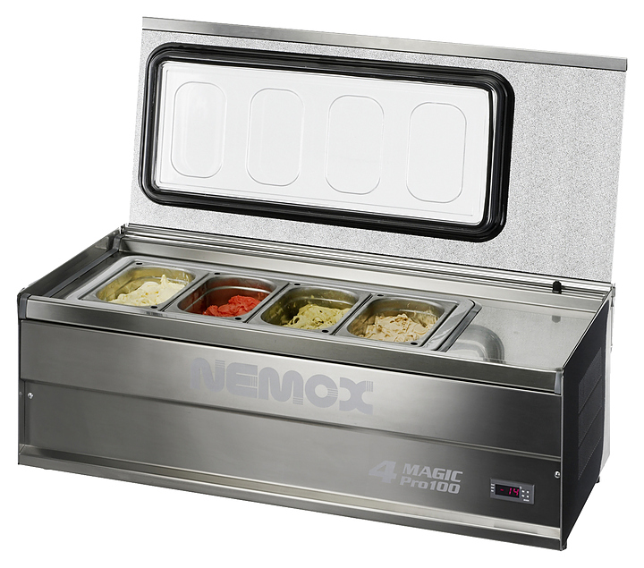 Настольная витрина для мороженого Nemox 4 Magic Pro100 используется в барах, кафе, на открытых летних площадках, в специальных отделах супермаркетов и торговых центрах для демонстрации и кратковременного хранения мороженого, сорбета и других продуктов. Модель оснащена электронным управлением с дисплеем. Корпус и гастроемкости выполнены из нержавеющей стали, крышка - из двойного стекла. В комплект поставки входят 4 гастроемкости с крышками из поликарбоната и 4 лопатки для мороженого. Особенности: