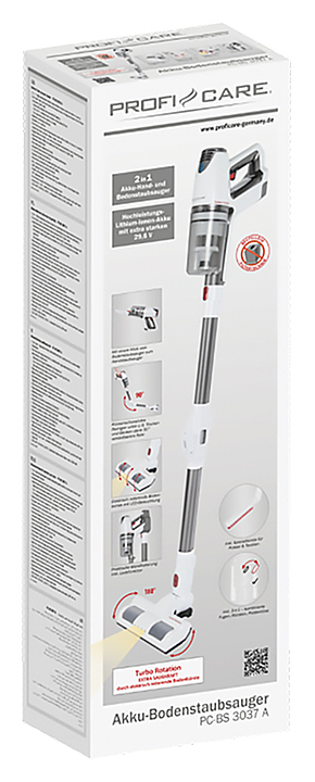 Аккумуляторный пылесос ProfiCare PC-BS 3037 A предназначен для обработки полов, ковров, мягкой мебели и других поверхностей в частных домах, квартирах, отелях и офисах. Модель оснащена настенным креплением с функцией зарядки и регулируемой на 90° трубкой из алюминия. В комплект поставки входят электрическая вращающаяся щетка для пола, щетка для обивки и текстиля и длинная насадка 3 в 1. Особенности: