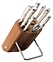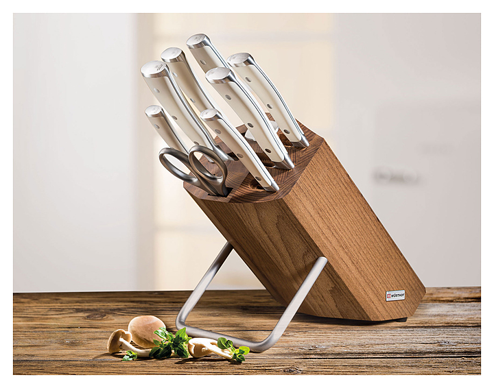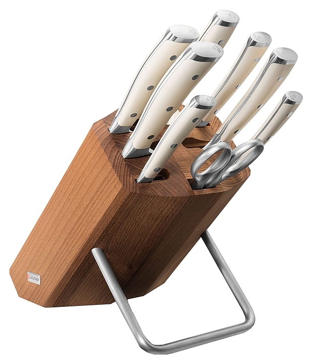 Набор кухонных ножей Wüsthof Ikon Cream White 9879 WUS предназначен для использования на предприятиях общественного питания и торговли, а также в частных домах и квартирах. Изделия выполнены из высокоуглеродистой нержавеющей молибден-ванадиевой стали X50CrMoV15, отличающейся высочайшим уровнем прочности, повышенной стойкостью к коррозии и оптимальной твердостью. Рукоять ножей изготовлена из полиоксиметилена - инновационного синтетического материала с оксидом кремния, который обладает высочайшей ударопрочностью, влагонепроницаемостью и гигиеничностью, подставка - из бука. Комплектация: