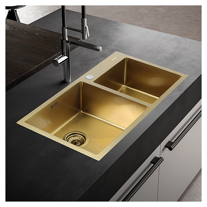 Кухонная мойка MELANA 7843 ProfLine S7843HG выполнена в современном стиле. Модель с одной основной чашей, в которой можно помыть сковородки, кастрюли, противни и другую посуду любого размера и дополнительной чашей меньшего размера. Корзинчатый вентиль, расположенный в сливном отверстии, выполняет функцию фильтра. Изделие выполнено нержавеющей стали с PVD-покрытием, которое придает мойке привлекательный вид, делает ее более долговечной и устойчивой к появлению царапин, а также способствует стеканию воды со стенок чаши. Двойной сифон с выводом для канализации и набор крепежей для базового способа установки входят в комплект поставки. Особенности: