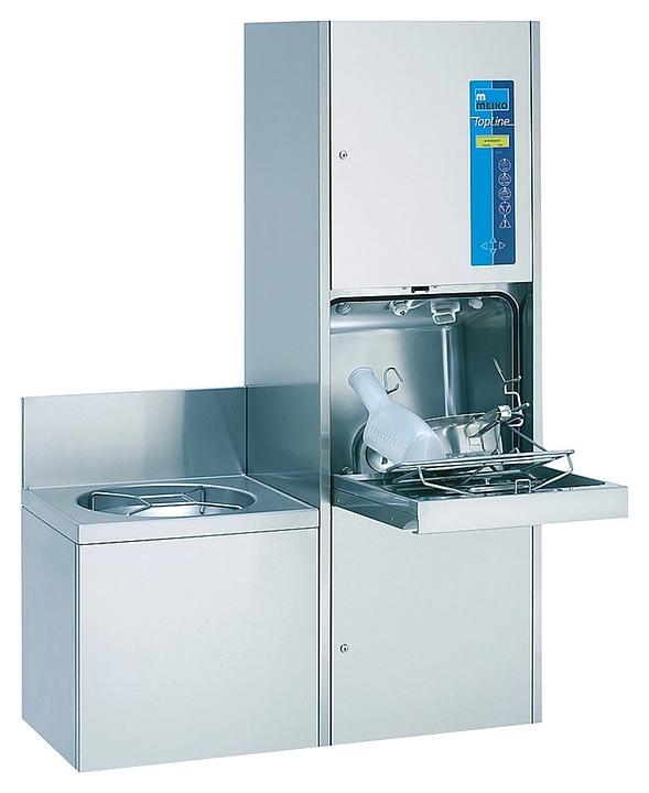 Настенная моюще-дезинфицирующая машина Meiko Topline 10A со сливной раковиной предназначена для гигиенической обработки и дезинфекции предметов ухода за больными в санаторно-профилактических, паллиативных и других медицинских учреждениях. Модель оснащена вместительной камерой с держателем и рукавом для обработки предметов, надежно блокируемой герметичной дверью, запираемыми на ключ техническими отделениями и удобной панелью управления с мембранной клавиатурой и цифровым дисплеем индикации. Корпус и облицовка камеры выполнены из нержавеющей стали. Особенности: