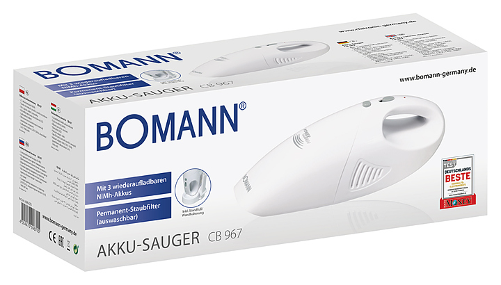 Аккумуляторный пылесос Bomann CB 967 предназначен для чистки обивки мебели, штор, книг и компьютеров в частных домах и квартирах, а также подходит для уборки в автомобиле. Модель оснащена постоянным моющимся пылевым фильтром и светодиодным индикатором заряда. В комплект поставки входят щетка, щелевая насадка и зарядное устройство. Особенности: