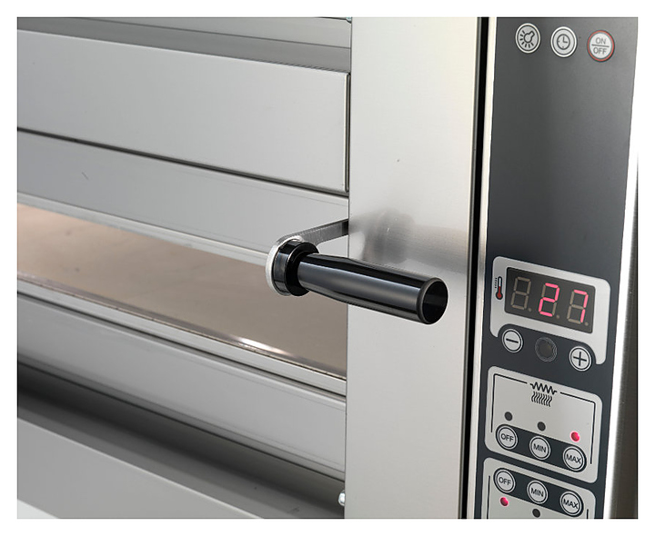 Печь для пиццы Cuppone Donatello DN435/2CD используется на предприятиях общественного питания и торговли. Модель оснащена 2 панелями управления с цифровыми коммутаторами, дверями с обзорными стеклами и галогеновым освещением камер выпекания. Фасад и камеры выпекания выполнены из нержавеющей стали. Печь используется совместно с вытяжным зонтом Cuppone KDN635AS. Особенности: