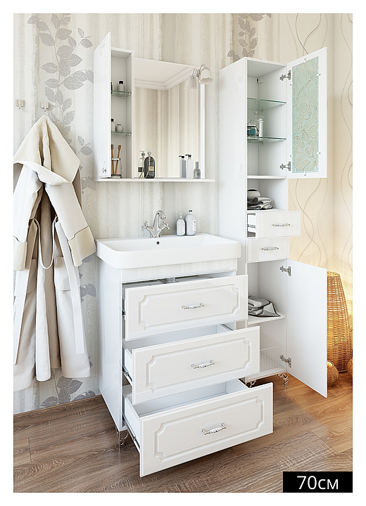 Тумба Sanflor Ксения выполнена в классическом стиле. Благодаря изысканному стилю мебель станет украшением любой ванной комнаты. Тумба оснащена 4 ящиками с механизмом плавного закрытия. Раковина имеет слив-перелив и одно отверстие для смесителя, расположенное по центру. Каркас выполнен из влагостойкой ЛДСП с эмалевым покрытием. В комплект входит раковина Santek Тигода 70. Тумба является частью гарнитура для ванной комнаты Ксения. Особенности: