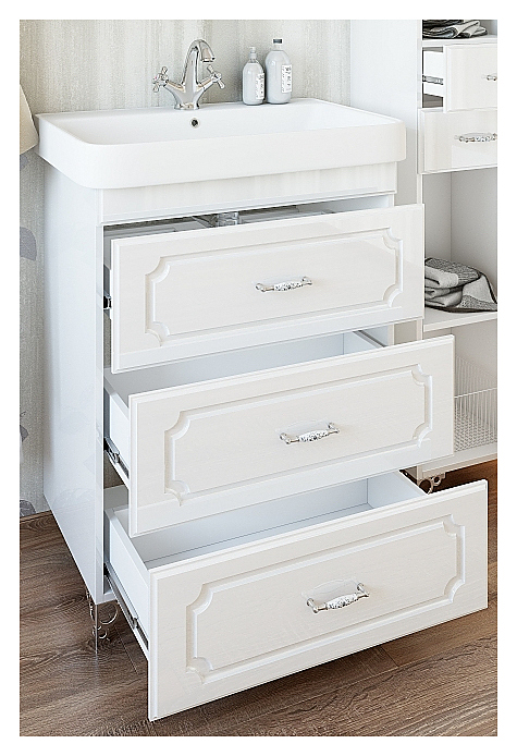 Тумба Sanflor Ксения выполнена в классическом стиле. Благодаря изысканному стилю мебель станет украшением любой ванной комнаты. Тумба оснащена 4 ящиками с механизмом плавного закрытия. Раковина имеет слив-перелив и одно отверстие для смесителя, расположенное по центру. Каркас выполнен из влагостойкой ЛДСП с эмалевым покрытием. В комплект входит раковина Santek Тигода 80. Тумба является частью гарнитура для ванной комнаты Ксения. Особенности: