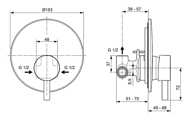Смеситель для душа Ideal Standard CERALINE A6940XG предназначен для использования в ванных помещениях для подачи горячей и холодной воды. Модель оснащена функцией ограничения максимальной температуры горячей воды для предотвращения ожогов, а также функцией ограничения потока воды. Изделие выполнено из высококачественной латуни, которая отличается прочностью, долговечностью и устойчивостью к перепадам температур. В комплект поставки входят встраиваемая и внешняя части. Особенности: