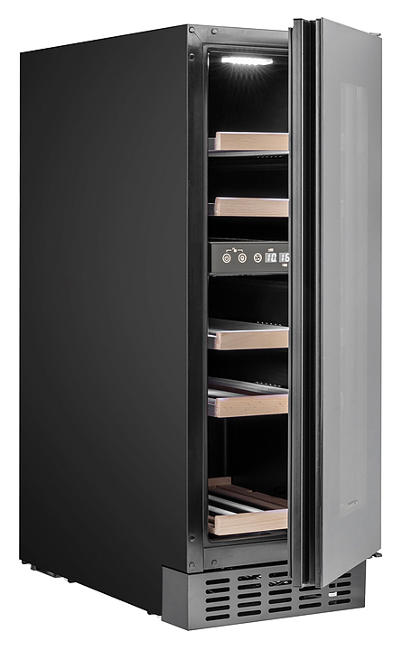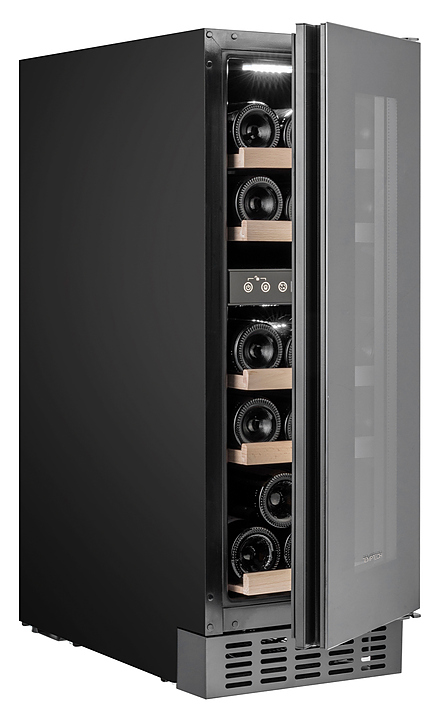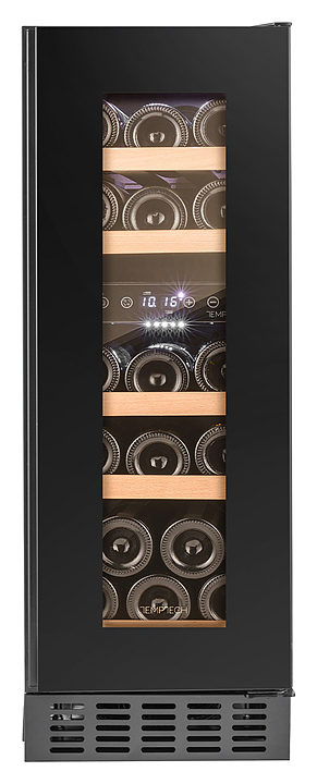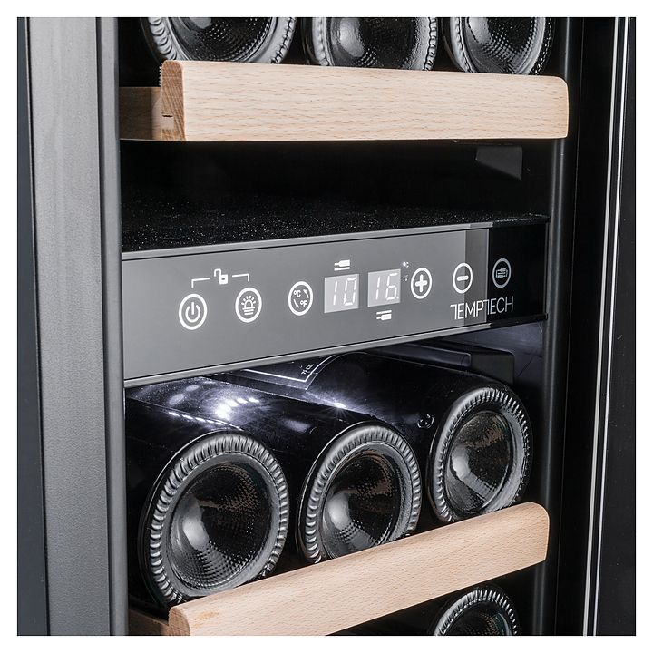 Винный шкаф Temptech Oslo OX30DRB предназначен для охлаждения, хранения и демонстрации бутилированного вина в отелях, винных магазинах, на предприятиях общественного питания и торговли. Модель оснащена сенсорной панелью с дисплеем для регулировки температуры и освещения, 5 полками, дверцей со встроенной ручкой и белой светодиодной подсветкой. Дверца выполнена из двухслойного стекла, заполненного аргоном, и с защитой от УФ-лучей, передняя панель - из черного стекла, полки - из бука. Особенности: