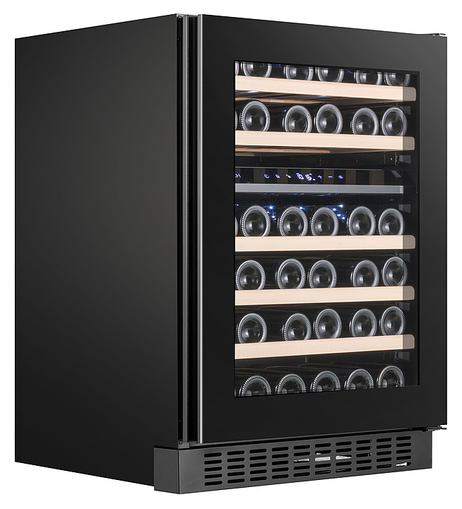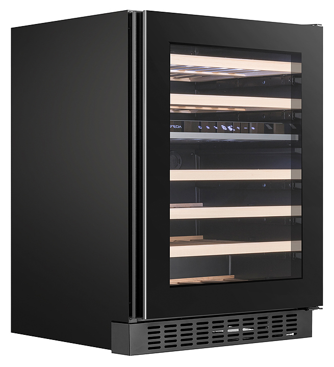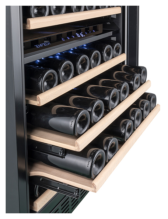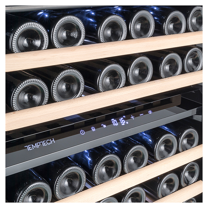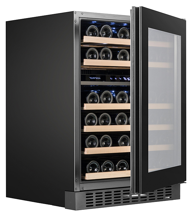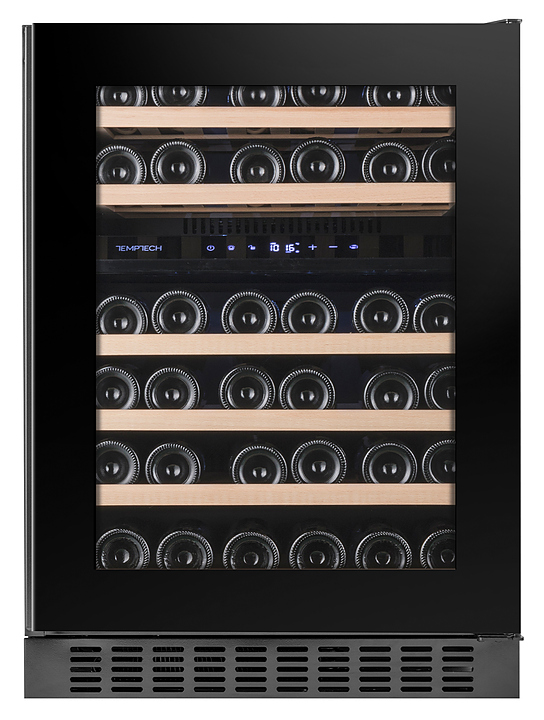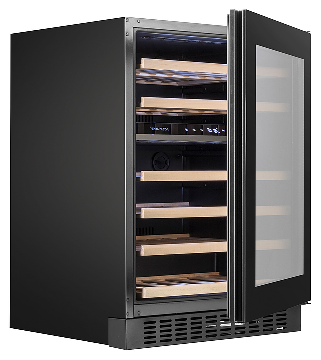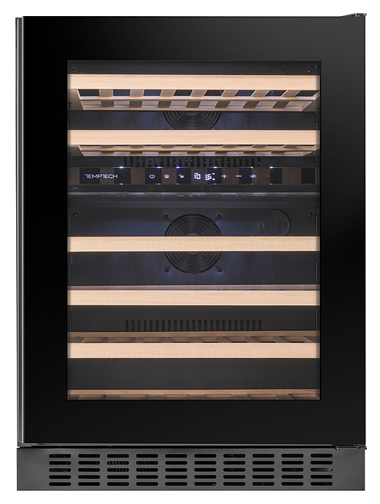 Винный шкаф Temptech Oslo OX60DRB предназначен для охлаждения, хранения и демонстрации бутилированного вина в отелях, винных магазинах, на предприятиях общественного питания и торговли. Модель оснащена сенсорной панелью с дисплеем для регулировки температуры и освещения, 6 полками, дверцей со встроенной ручкой, фильтром с активированным углем и белой светодиодной подсветкой. Дверца выполнена из двухслойного стекла, заполненного аргоном, и с защитой от УФ-лучей, передняя панель - из черного стекла, полки - из бука. Особенности: