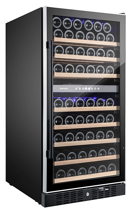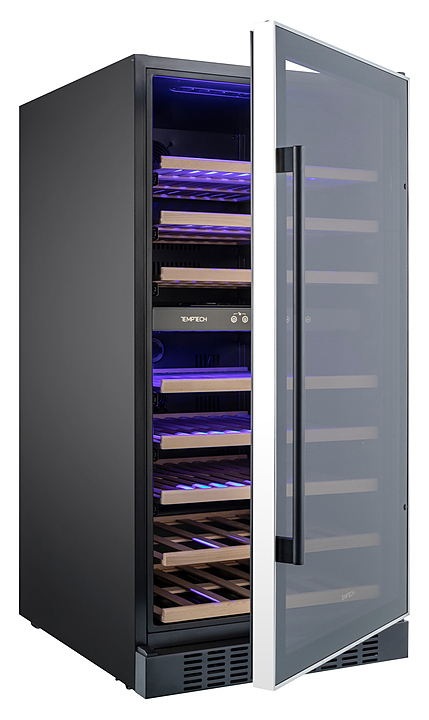 Винный шкаф Temptech Premium WP120DCB предназначен для охлаждения, хранения и демонстрации бутилированного вина в отелях, винных магазинах, на предприятиях общественного питания и торговли. Модель оснащена сенсорной панелью с дисплеем для регулировки температуры и освещения, 8 выдвижными полками, дверцей с замком, фильтром с активированным углем и синей светодиодной подсветкой. Дверца выполнена из двухслойного стекла, заполненного аргоном, и с защитой от УФ-лучей, передняя панель - из черного стекла в тонкой стальной раме, полки - из бука. Особенности: