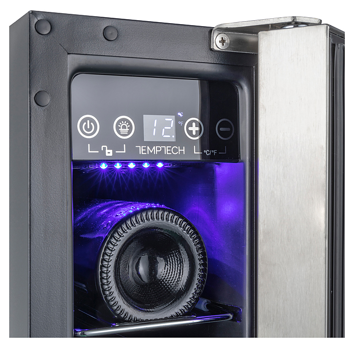Винный шкаф Temptech Premium WPQ15SCB предназначен для охлаждения, хранения и демонстрации бутилированного вина в отелях, винных магазинах, на предприятиях общественного питания и торговли. Модель оснащена сенсорной панелью с дисплеем для регулировки температуры и освещения, 6 полками и синей светодиодной подсветкой. Дверца выполнена из трехслойного стекла с защитой от УФ-лучей, передняя панель - из черного стекла в тонкой стальной раме, полки - из нержавеющей стали. Особенности: