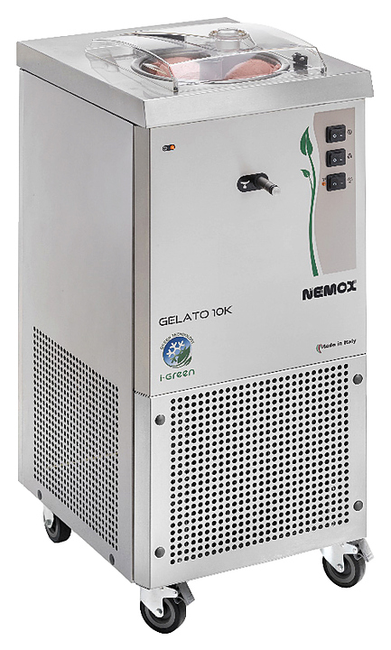 Фризер для мороженого Nemox i-Green Gelato 10K используется в барах, кафе, на открытых летних площадках, в специальных отделах супермаркетов и торговых центрах для приготовления мороженого кремообразной текстуры, сорбета, гранита и других холодных десертов. Модель оснащена простой интуитивно понятной панелью управления с 3 кнопками, индукционным двигателем с термостатом, фиксированной емкостью и крышкой с отверстием для добавления ингредиентов и датчиком, блокирующим вращение лопасти при ее подъеме. Корпус выполнен из нержавеющей стали AISI 304, емкость и лопасти для перемешивания - из нержавеющей стали. В комплект поставки входят лопатка для мороженого, набор съемных насадок для лопастей, уплотнитель и щетка для очистки слива. Особенности: