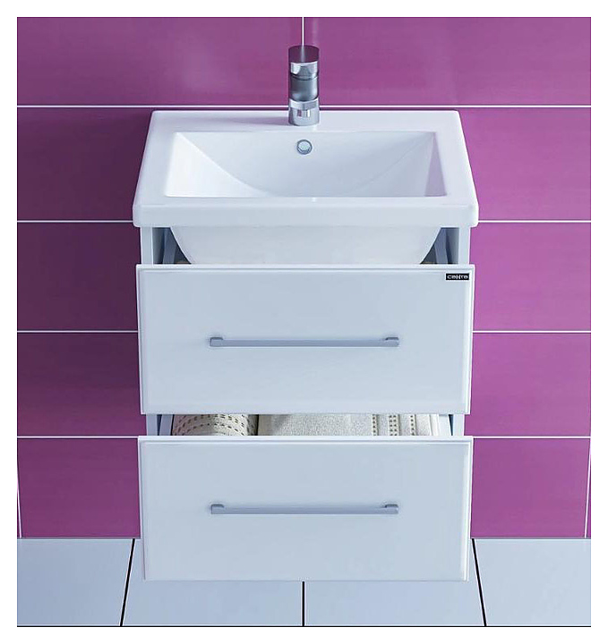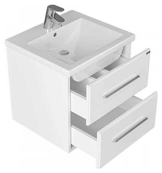 Тумба под раковину СаНта Омега 50 дополнит интерьер ванной комнаты. Благодаря подвесной конструкции модель не занимает много места, что экономит пространство в ванной комнате и облегчает уборку. Тумба оснащена 2 выдвижными ящиками. Корпус выполнен из влагостойкой ЛДСП, фасад - из МДФ и покрыт ПВХ-пленкой для защиты поверхности от внешних воздействий. Тумба используется вместе с раковиной Фостер 50. В комплект поставки входят 2 ручки. Особенности: