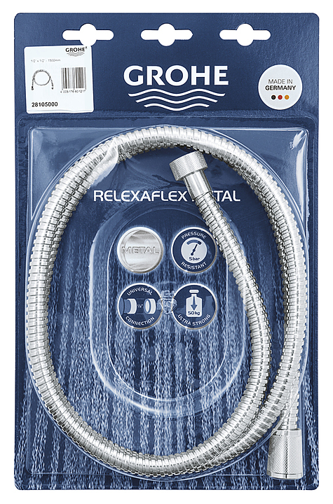 Душевой шланг металлический Grohe Relexaflex Metal Longlife 28143000 предназначен для использования в душевой системе или душевом гарнитуре. Соединительные гайки оснащены ребристой поверхностью для оптимального захвата. Изделие имеет покрытие StarLight, устойчивое к царапинам и обеспечивающее блеск на много лет. Особенности: