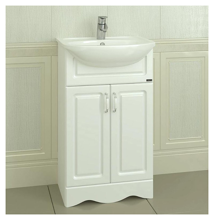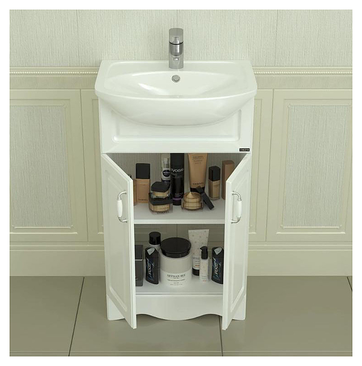 Тумба под раковину СаНта Верона 50 дополнит интерьер ванной комнаты. Модель оснащена 2 распашными дверцами. Корпус выполнен из влагостойкой ЛДСП, фасад - из МДФ и покрыт пленкой для защиты поверхности от внешних воздействий. Тумба используется вместе с раковиной Уют 50. В комплект поставки входят 2 ручки. Особенности:
