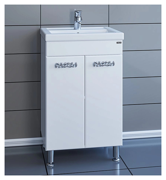 Тумба под раковину СаНта Ливерпуль 50 дополнит интерьер ванной комнаты. Модель оснащена 2 распашными дверцами и ножками, защищающими конструкцию от воздействия влаги в случае намокания пола. Корпус выполнен из влагостойкой ЛДСП, фасад - из МДФ и покрыт пленкой для защиты поверхности от внешних воздействий. Тумба используется вместе с раковиной Фостер 50. В комплект поставки входят 2 ручки, 2 хромированные и 2 пластиковые ножки. Особенности: