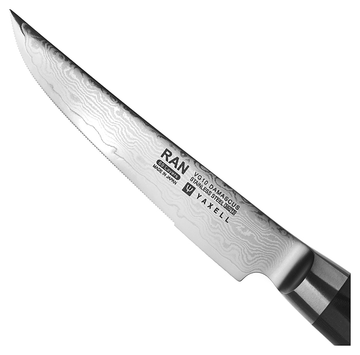 Кухонный нож YAXELL Steak YA36013 серии Run предназначен для правильной и аккуратной нарезки стейков на предприятиях общественного питания и торговли и для домашнего применения. Изделие оснащено зубчатым лезвием. Лезвие изготовлено из сверхпрочной стали VG-10 Laminated, состоящей из кобальта, молибдена, ванадия и углерода, в обкладке из высокоуглеродистой нержавеющей стали по 34 слоя с каждой стороны, рукоять - из черного полимерного материала Canvas Micarta на основе льняного полотна и смолы, заклепки рукояти и больстеры - из нержавеющей стали. Особенности:
