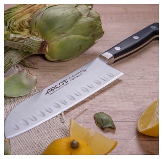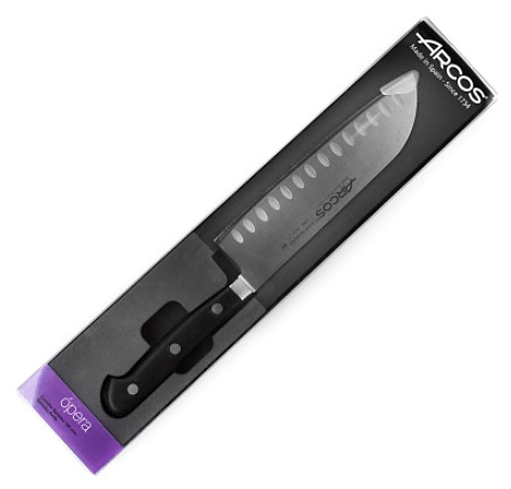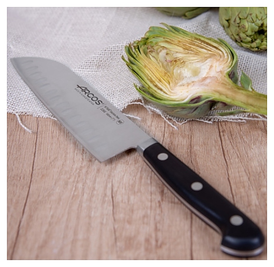Кухонный нож Сантоку ARCOS Opera 226600 предназначен для нарезки продуктов на предприятиях общественного питания и торговли, а также в частных домах и квартирах. Клинок выполнен из обогащенного азотом, стального сплава NITRUM и является не только нержавеющим, но и экологичным, поскольку его производство не оказывает негативного воздействия на окружающую среду. Он устойчив к коррозии, отличается долговечностью, сохранением режущей кромки и презентабельным внешнем видом во время всего периода эксплуатации. Рукоять изготовлена из полиоксиметилена, который отличаются износостойкостью, устойчивостью к воздействию разницы температур, пластичностью, прочностью и отсутствием взаимодействия с влагой, кислотными или щелочными растворами. Особенности: