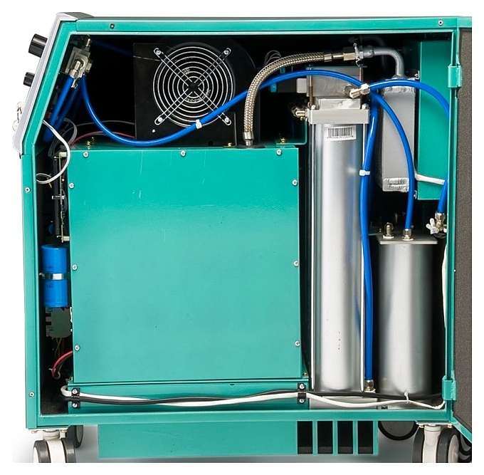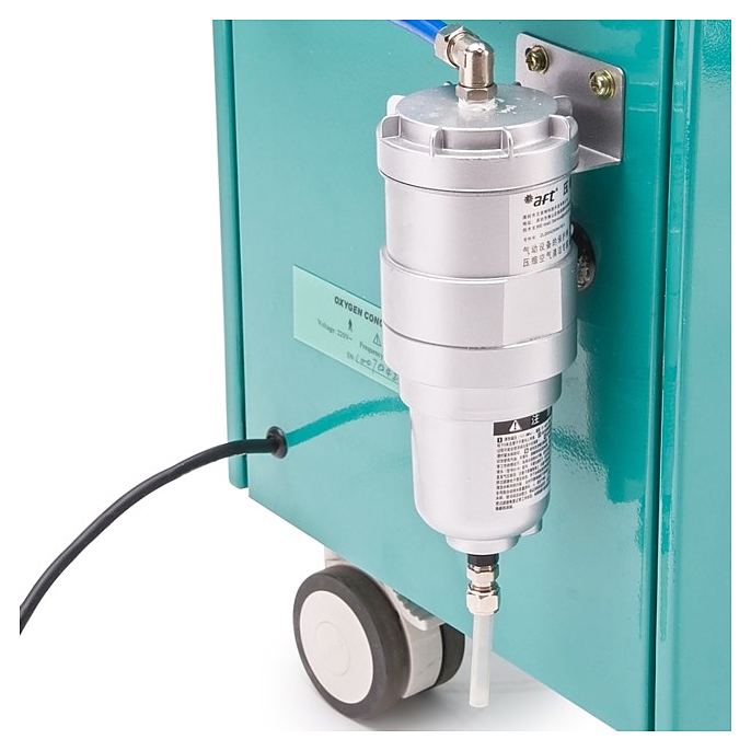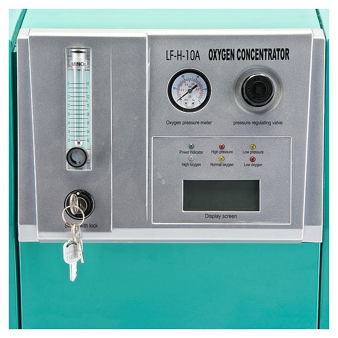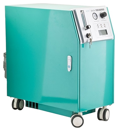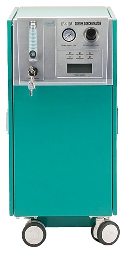 Концентратор кислорода Армед LF-H-10А предназначен для выделения кислорода из окружаюшего воздуха и совместного использования с аппаратами искусственной вентиляции легких, наркозными аппаратами, увлажнителями и другим кислородным оборудованием в раниманицонном или операционном отделениях больниц, стоматологических, косметологических, ветеринарных клиниках и других медицинских и лечебно-профилактических учреждениях. Принцип работы: абсорбция цеолитом азота из воздуха при прохождении воздушной смеси сквозь молекулярное решето и систему фильтров с получением высококонцентрированной кислородной смеси на выходе. Модель оснащена кабелем питания с вилкой, четырехколесным шасси, панелью управления с пусковым замком, регулятором клапана давления, расходомером, манометром, цифровым дисплеем и светодиодными лампами индикации. Корпус изготовлен из металла с лакокрасочным покрытием, колеса – из прочного пластика. В комплект поставки входят 2 кислородных шланга различной длины и стартовый ключ. Особенности: