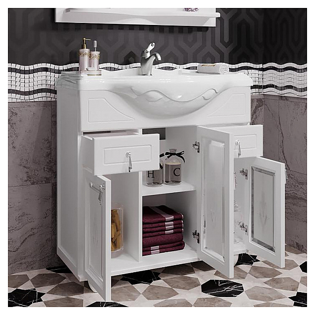 Раковина со смесителем в комплект поставки не входят и приобретаются отдельно. Тумба является частью гарнитура для ванной комнаты Тибет 85 с художественным стеклом, белый матовый. Дополнительные характеристики: