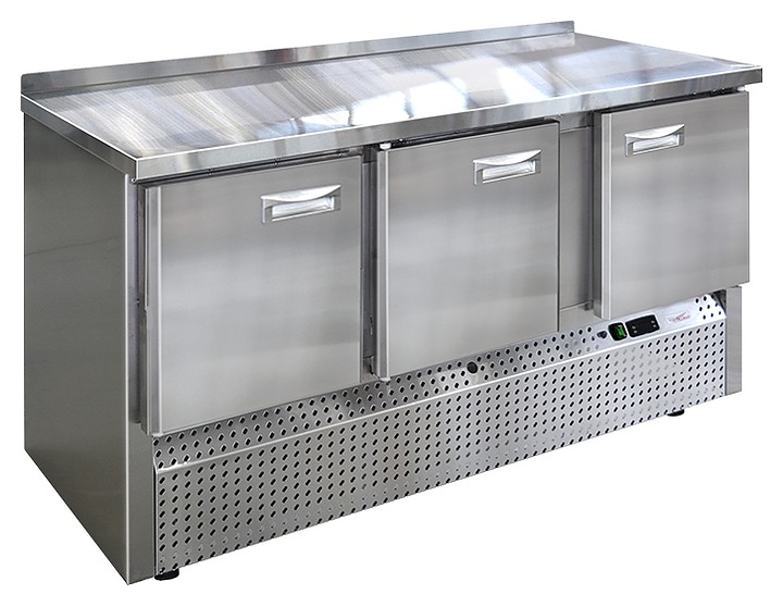 Морозильный стол Finist НХСн-700-3 предназначен для хранения предварительно замороженных пищевых продуктов на предприятиях общественного питания и торговли. Модель оснащена расположенным снизу агрегатным отсеком, столешницей с задним бортом, 3 холодильными камерами с распашными дверцами, устойчивыми ножками с подпятниками, кабелем питания с евровилкой и кнопочной панелью управления с цифровым дисплеем. Цельнозаливной корпус выполнен из высококачественной нержавеющей стали. Особенности: