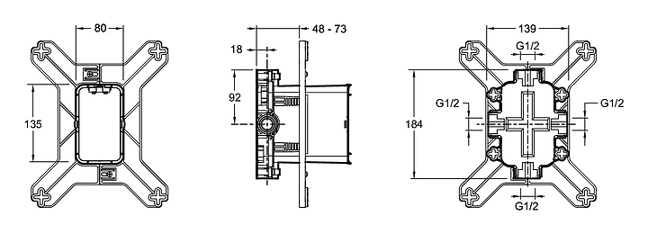 Механизм Jacob Delafon MODULO 98699D-NF предназначен для монтажа встраиваемого смесителя. Лицевую сторону коробки можно использовать в качестве трафарета. Модель отличается легкой заменой клапана и заглушки, что обеспечивает возможность переключиться с механического на термостатический режим. Особенности: