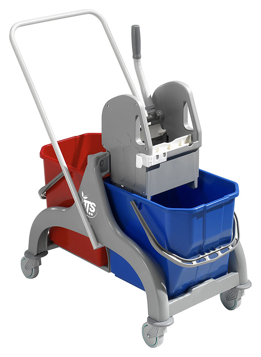 Уборочная тележка TTS Nick Light 50 предназначена для профессиональной влажной уборки в офисах, торговых центрах, гостиницах, на предприятиях общественного питания и других местах массового пребывания малой и средней площадей. Модель оснащена цельной рамой, дугообразной рукояткой, 4 колесами и 2 ведрами со складной ручкой. Рама и ведра выполнены из ударопрочного полипропилена, рукоятка – из стали с антикоррозийным полиамидным покрытием. Устройство для отжима не входит в комплект поставки и приобретается отдельно. Особенности: