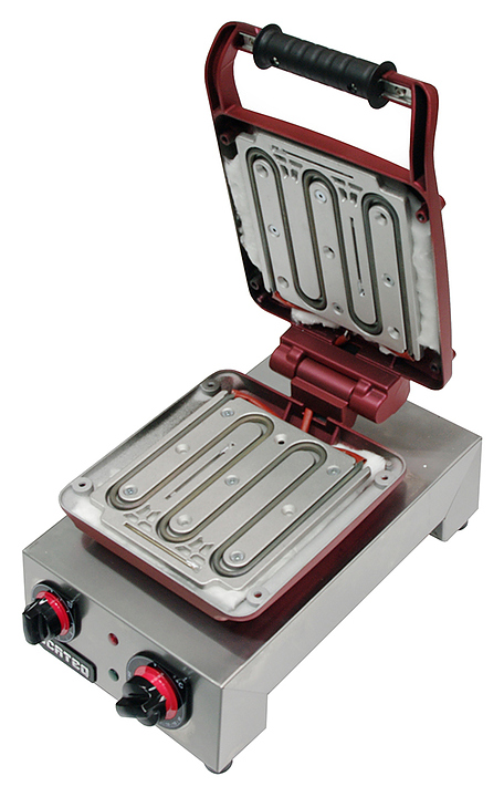 Вафельница Kocateq GH15TWI используется на предприятиях общественного питания и торговли, в пекарнях и кондитерских для выпекания вафель. Модель оснащена откидной верхней пластиной с ручкой, панелью управления со светодиодными лампами индикации и пластиковыми ножками. Корпус выполнен из сплава алюминия с антипригарным покрытием бордового цвета, основание и лоток - из нержавеющей стали AISI 304. Рабочие пластины в комплект поставки не входят и приобретаются отдельно. Заказ вафельницы возможен только с 1 из пластин в комплекте. Особенности: