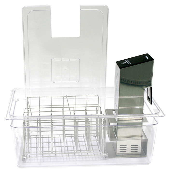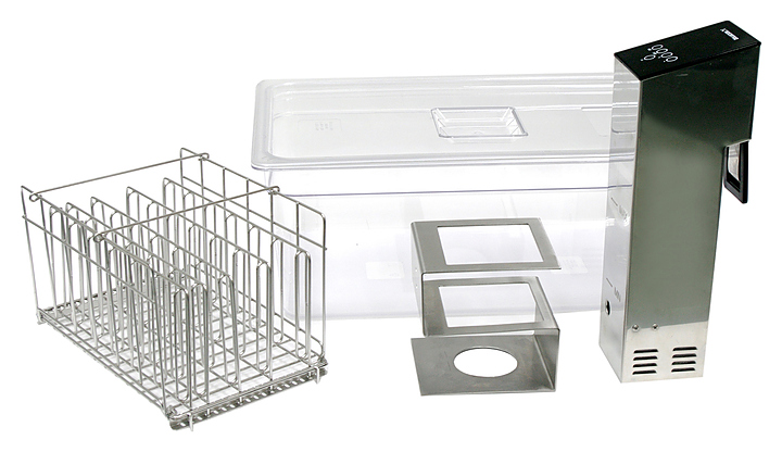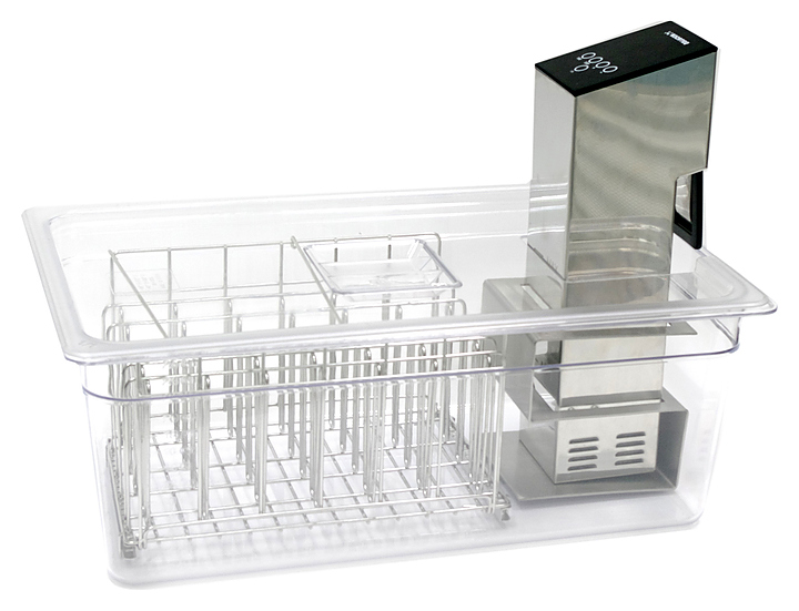 Ротационный кипятильник Kocateq BM200SVset предназначен для поддержания постоянной температуры воды в произвольной емкости с её активным перемешиванием по технологии Sous Vide на предприятиях общественного питания и торговли. Модель оснащена сенсорной панелью управления и таймером до 99 часов. Все части, контактирующие с водой, и корпус выполнены из нержавеющей стали AISI 304, держатель термостата и разделитель - из нержавеющей стали. В комплект поставки входят гастроемкость GN1/1 глубиной 200 мм из прозрачного поликарбоната объемом 22 л, крышка из поликарбоната с вырезом под термостат, держатель термостата и кассета для вакуумных пакетов. Особенности: