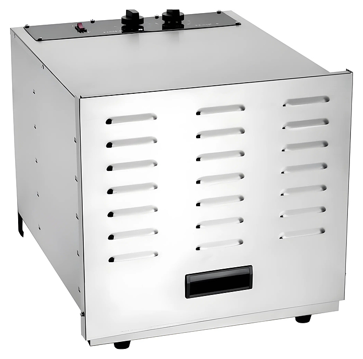 Дегидратор VIATTO VA-DG10SS предназначен для равномерной сушки овощей, грибов, фруктов, ягод, трав, орехов посредством конвекции, а также для приготовления пастилы, овощных, фруктовых чипсов, хлебцев, сушеного мяса, рыбы и других продуктов на предприятиях общественного питания и торговли. Модель оснащена дверцей с термовыводящими отверстиями и механической панелью управления. Корпус выполнен из нержавеющей стали, решетки – из железа с никелированным покрытием. В комплект поставки входят 10 съемных решеток. Особенности: