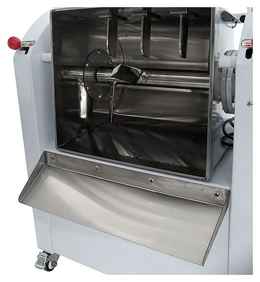 Тестомесильная машина Foodatlas WHM(J)-12,5 используется на предприятиях общественного питания и торговли для замеса крутого теста для пельменей, лаваша, мантов, чебуреков и других хлебо-булочных изделий, а также перемешивания ингридиентов соусов и начинок. Модель оснащена поворотной дежой с крышкой и ручкой, горизонтальным месильным органом J-образной формы с 4 лопастями, наклонным лотком для выгрузки и электромеханической панелью управления. Корпус выполнен из окрашенного металла с термовыводящими отверстиями, месильный орган, дежа и лоток – из нержавеющей стали, смотровое окно – из оргстекла, упаковка – фанерный ящик. Особенности: