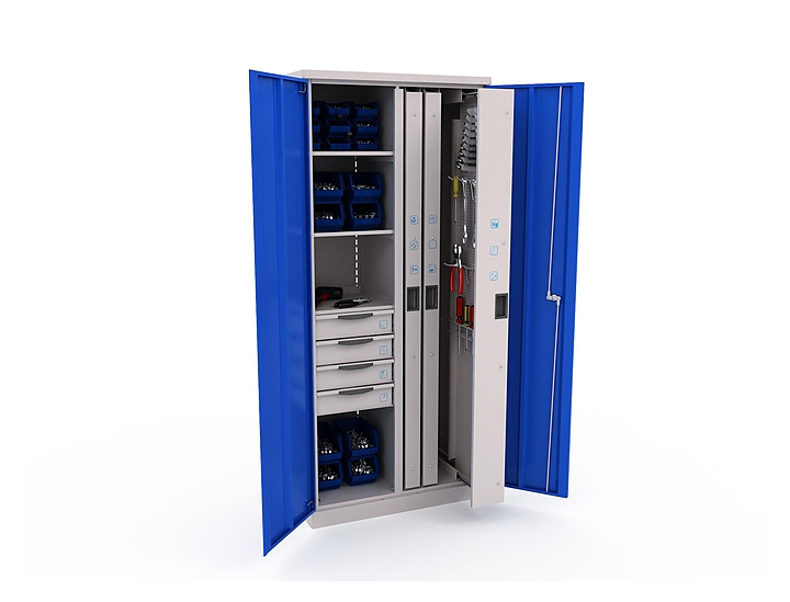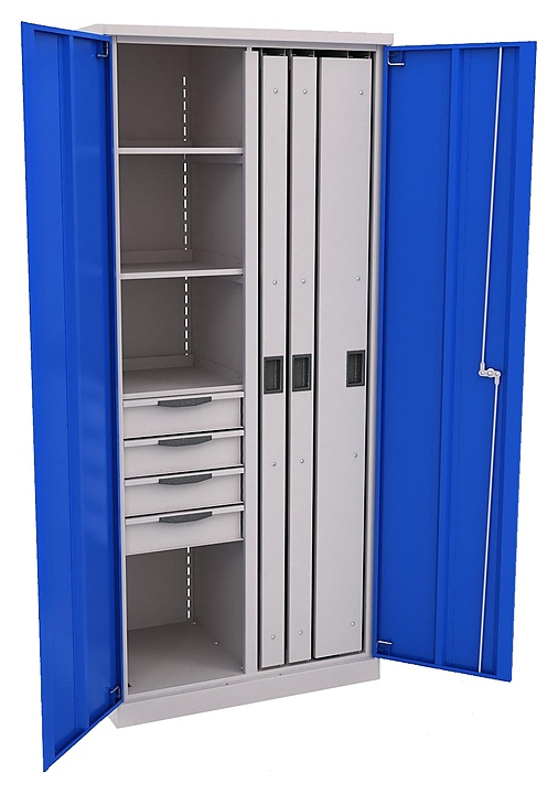 Шкаф ДВК ERGO 251 №6 предназначен для надежного хранения инструментов, оснастки, крепежа, оргтехники и одежды на производственных участках и станциях технического обслуживания. Модель оснащена 3 планшетами, 3 внутренними полками с перегородкой и 4 выдвижными ящиками. Корпус выполнен из металла. Комплектация: