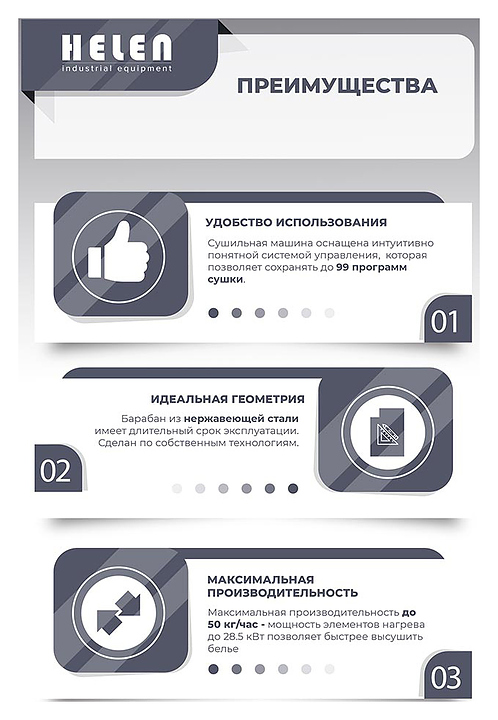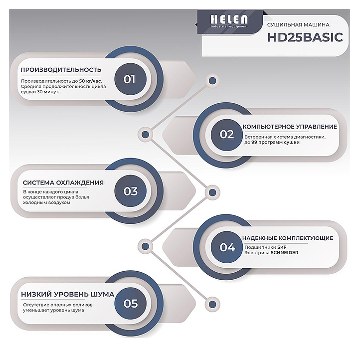 Сушильная машина HELEN HD 25 Basic используется в прачечных, гостиницах, салонах красоты, больницах и детских учреждениях для сушки различного белья и одежды с относительной влажностью до 50%. Модель оснащена микропроцессорной системой управления. Барабан выполнен из нержавеющей стали. Особенности: