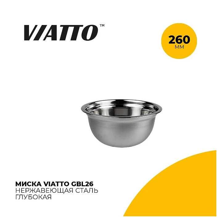 Миска VIATTO GBL26 используется на предприятиях общественного питания для приготовления широкого спектра блюд. Модель имеет удобную полусферическую форму. Посуда изготовлена из нержавеющей стали, толщиной 0,5 мм.