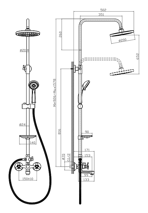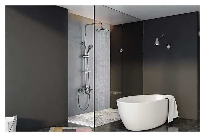 Душевая стойка Rossinka Q02-46 используется в ванных комнатах. Модель имеет круглые лейку и верхний душ. Стойка оснащена керамическими вентильными головками и пластиковым аэратором, который экономит расход воды, уменьшает шум, снижает количество брызг и отличается легкой очисткой. Комплектация: