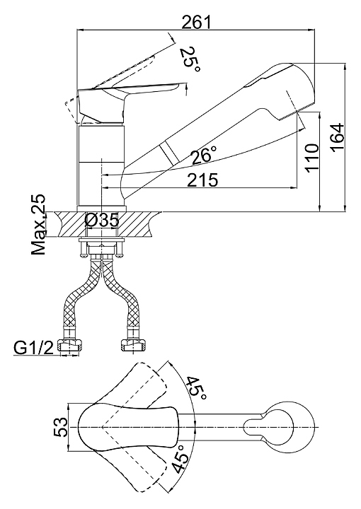 Смеситель D&K Rhein Reisling DA1272501 предназначен для использования в кухонных помещениях для подачи горячей и холодной воды. Модель оснащена изливом с двухрежимной выдвижной лейкой, керамическим картриджем, обеспечивающим плавный ход рычага смесителя, контроль и точность при выборе напора и температуры воды, а также аэратором для создания мягкой ровной струи без разбрызгивания. Изделие выполнено из высококачественной латуни, отличающейся прочностью, долговечностью и устойчивостью к перепадам температур. В комплект поставки входят cмеситель, шланг, лейка, гибкая подводка и крепежные гайки. Особенности: