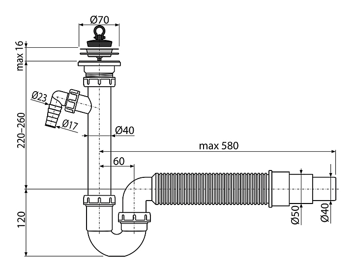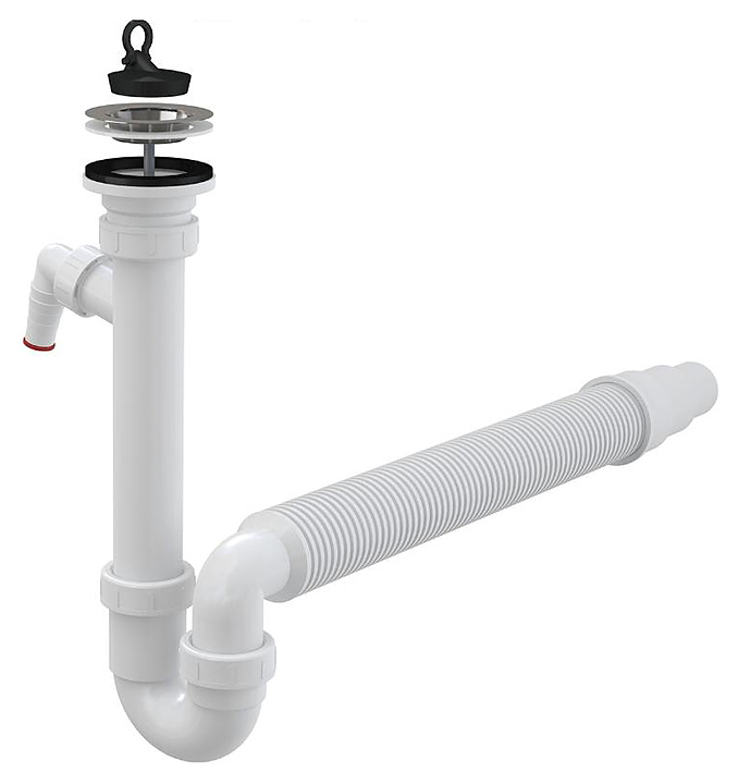 Сифон AlcaPlast A830-DN50/40 предназначен для установки с мойками. Изделие выполнено из полипропилена, пробка - из ПВХ, сливная решетка - из нержавеющей стали. В комплект поставки входят корпус со штуцером, гофрированный гибкий шланг, пробка и сливная решетка. Особенности: