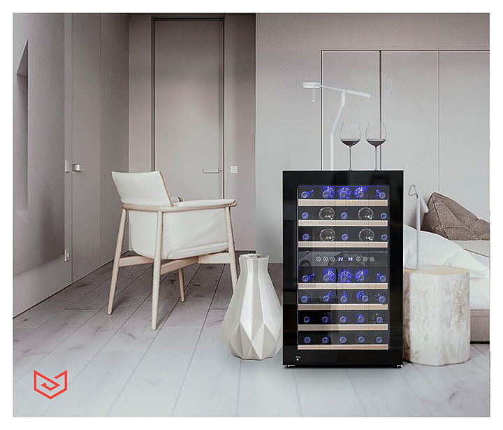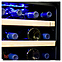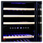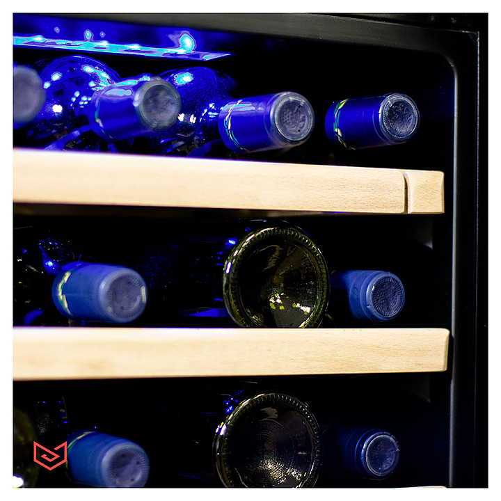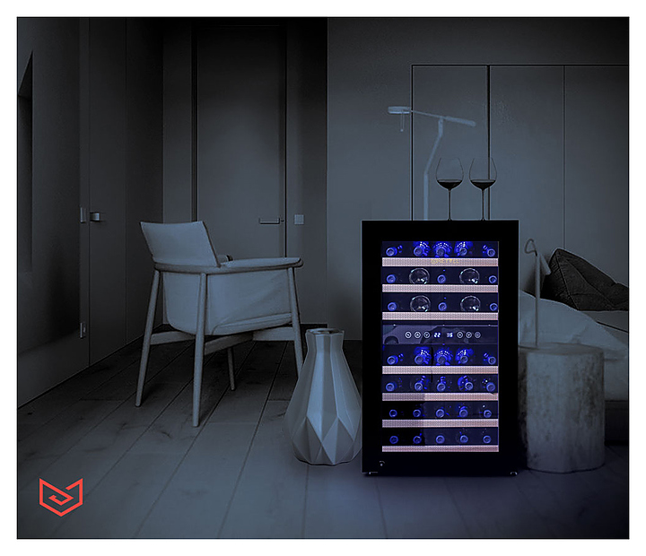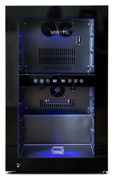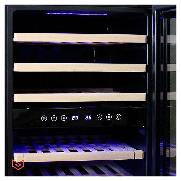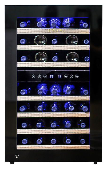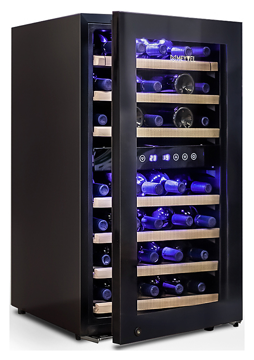 Винный шкаф MEYVEL MV45-KBF2 предназначен для демонстрации, хранения и создания оптимальных условий для сохранения всех вкусовых свойств вина в бутылках на предприятиях общественного питания, торговли, в барах, ресторанах, специализированных магазинах, частных домах или квартирах. Модель оснащена сенсорной панелью управления, электронным термостатом и светодиодной подсветкой синего цвета в каждой зоне. Корпус выполнен из окрашенной в черный цвет стали, дверь - двойного стекла с УФ защитой с черной рамкой, полки - из массива бука. Особенности: