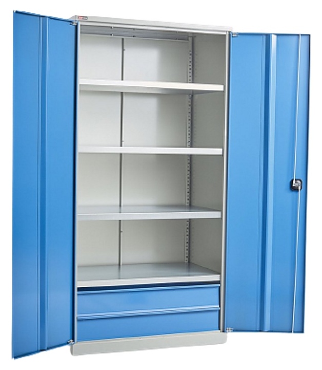 Инструментальный шкаф ДиКом ВЛ-052-05/Б предназначен для хранения инструментов, материалов и оснастки в мастерских, гаражах, профессиональных автосервисах и помещениях производственного назначения. Модель оснащена 4 оцинкованными полками и 2 выдвижными ящиками. Корпус и двери изготовлены из металла толщиной 0,8 мм. Особенности: