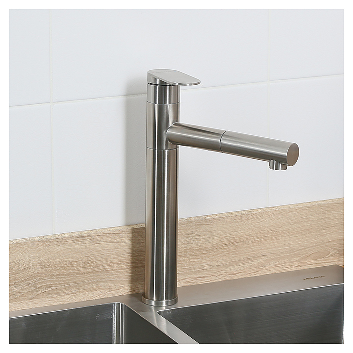 Смеситель MELANA F610303 Stello выполнен в современнм стиле и предназначен для подачи горячей и холодной воды в кухонных помещениях. Модель оснащена высоким поворотным изливом с выдвижной лейкой, керамическим картриджем, обеспечивающим плавный ход рычага смесителя, контроль и точность при выборе напора и температуры воды, а также аэратором для создания мягкой ровной струи без разбрызгивания. Однорычажный тип управления позволяет очень быстро и плавно регулировать подачу воды одной рукой. Изделие выполнено из нержавеющей стали, отличающейся повышенной устойчивостью к коррозии и долговечностью. Особенности: