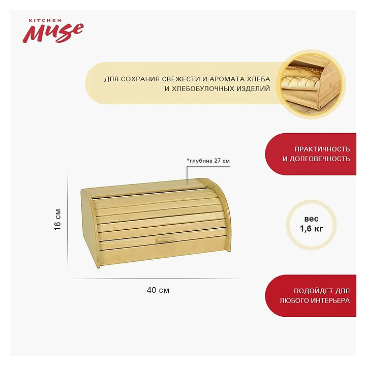 Хлебница Kitchen Muse KM-BBB-40 используется на предприятиях общественного питания, а также в домашних условиях для сохрания свежести и аромата хлеба и хлебобулочных изделий. Изделие выполнено из бамбука. Внимание! Информация о товарах, размещенная на сайте, не является публичной офертой, определяемой положениями Части 2 Статьи 437 Гражданского кодекса Российской Федерации. Производители вправе вносить изменения в технические характеристики, внешний вид и комплектацию товаров без предварительного уведомления. Уточняйте характеристики у наших менеджеров перед оформлением заказа. |