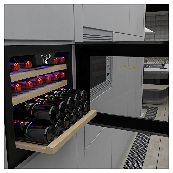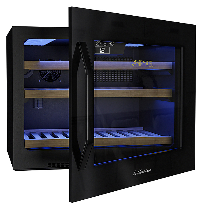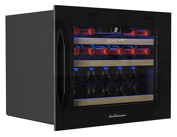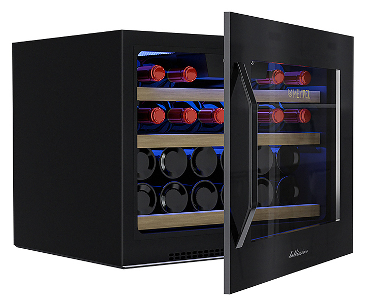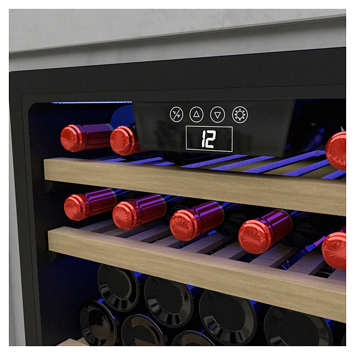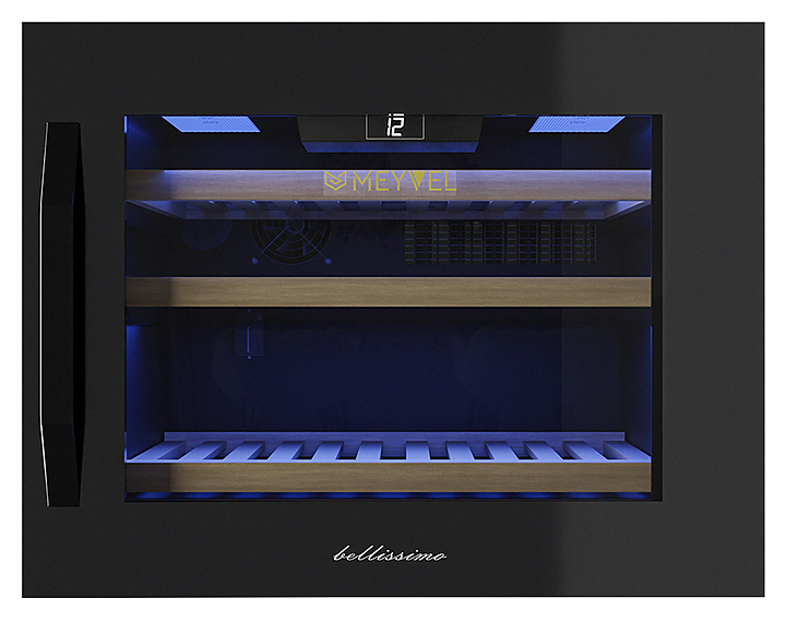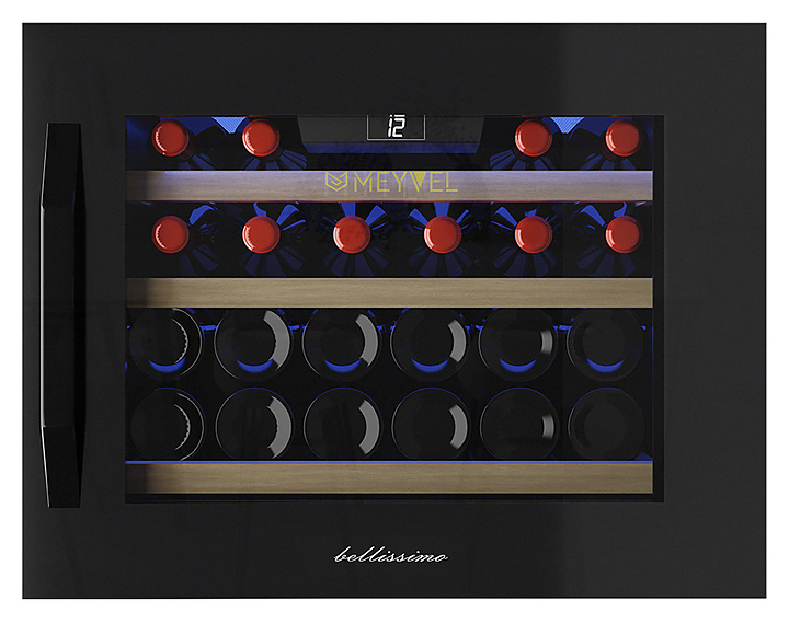 Винный шкаф MEYVEL MV22-KBB1 предназначен для демонстрации, хранения и создания оптимальных условий для сохранения всех вкусовых свойств вина в бутылках на предприятиях общественного питания, торговли, в барах, ресторанах, специализированных магазинах, частных домах или квартирах. Модель оснащена сенсорной панелью управления, электронным термостатом и внутренней светодиодной подсветкой. Корпус и дверная ручка выполнены из окрашенной в черный цвет стали, дверь - из двойного стекла с УФ защитой с черной рамкой, полки - из массива бука. Особенности: