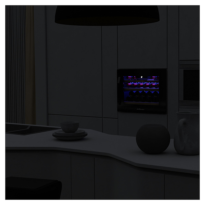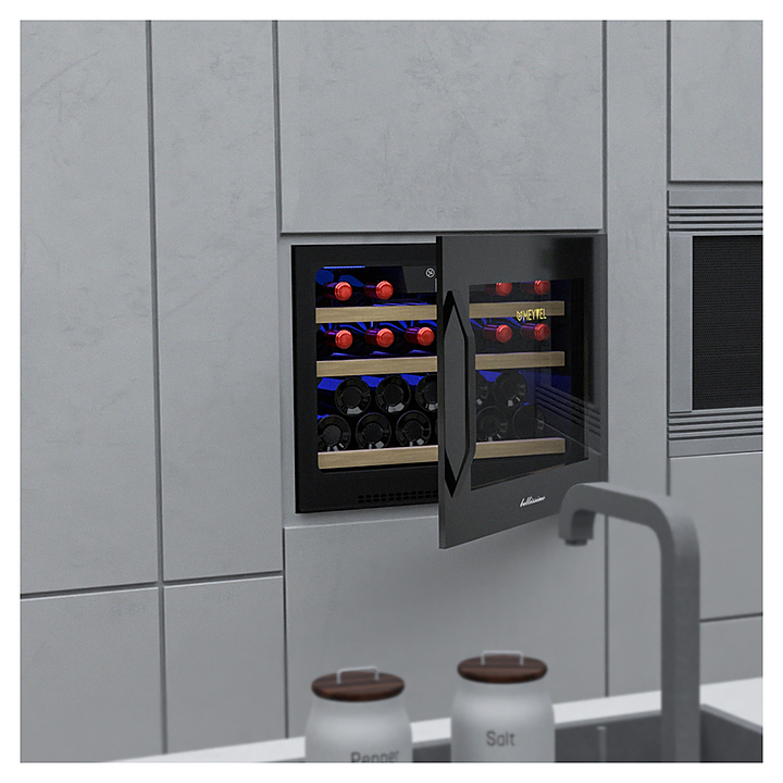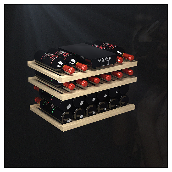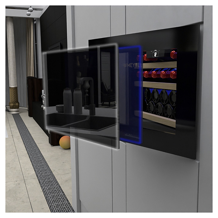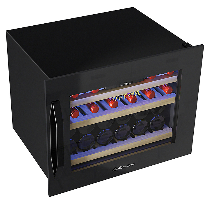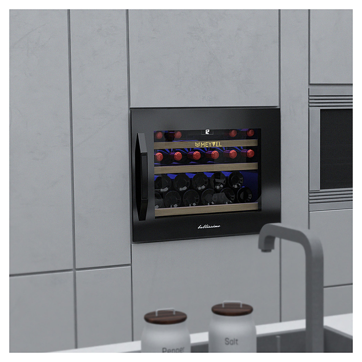 Винный шкаф MEYVEL MV22-KBB1 предназначен для демонстрации, хранения и создания оптимальных условий для сохранения всех вкусовых свойств вина в бутылках на предприятиях общественного питания, торговли, в барах, ресторанах, специализированных магазинах, частных домах или квартирах. Модель оснащена сенсорной панелью управления, электронным термостатом и внутренней светодиодной подсветкой. Корпус и дверная ручка выполнены из окрашенной в черный цвет стали, дверь - из двойного стекла с УФ защитой с черной рамкой, полки - из массива бука. Особенности: