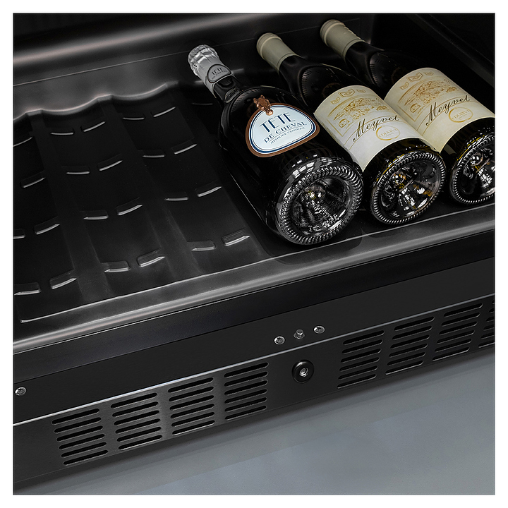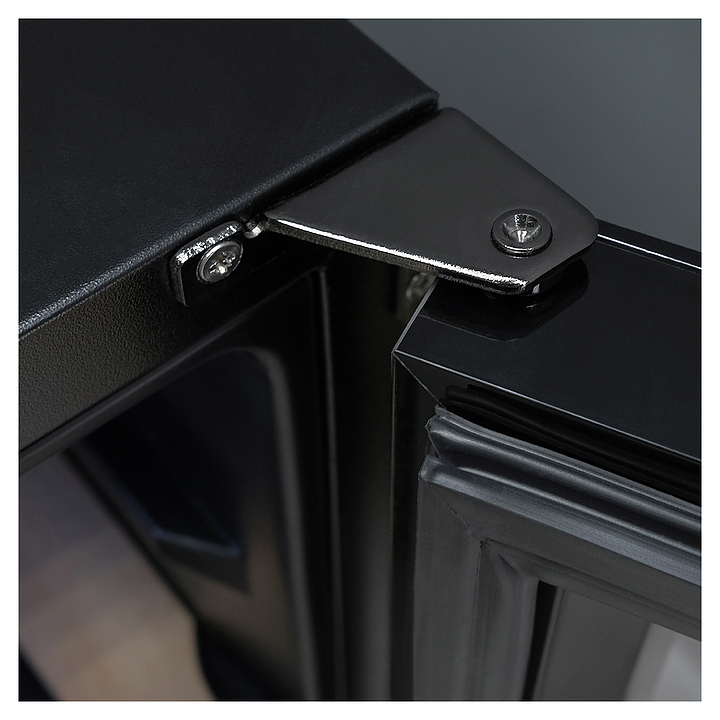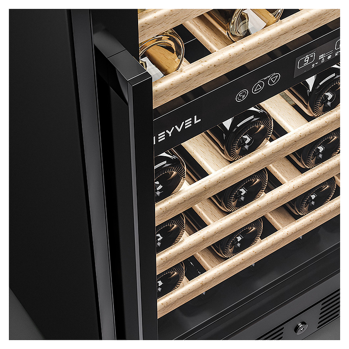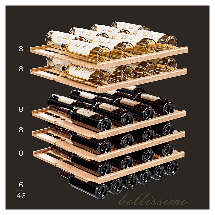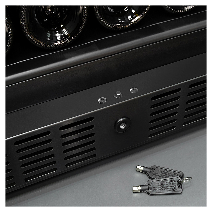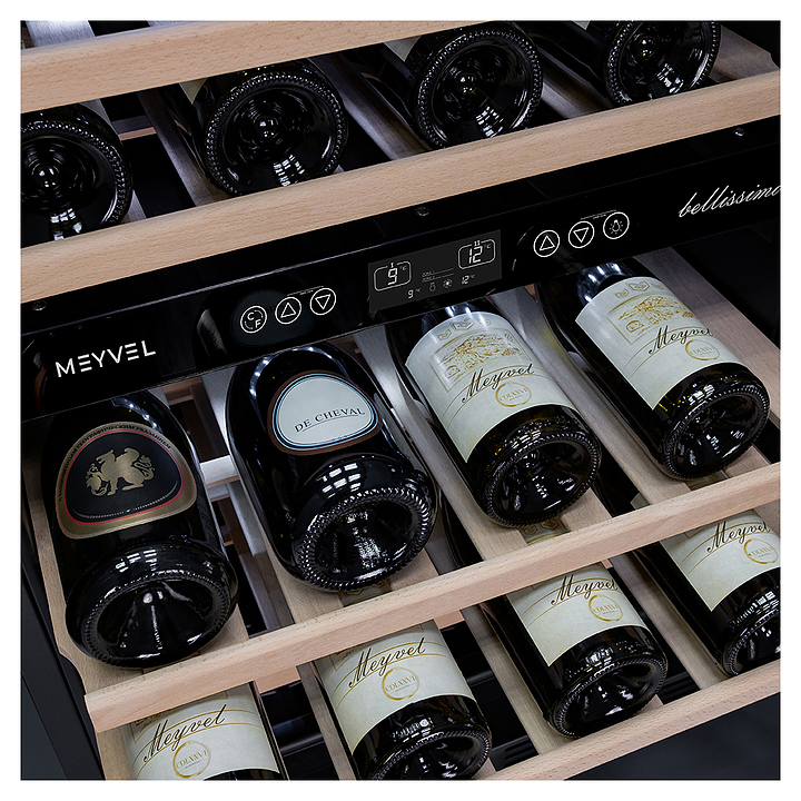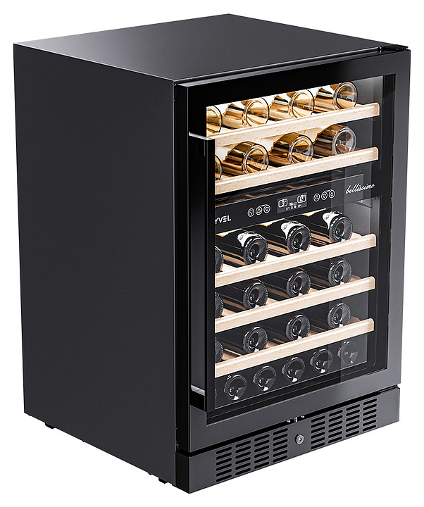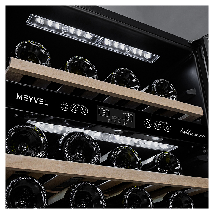 Винный шкаф MEYVEL MV46-KBT2 предназначен для демонстрации, хранения и создания оптимальных условий для сохранения всех вкусовых свойств вина в бутылках на предприятиях общественного питания, торговли, в барах, ресторанах, специализированных магазинах, частных домах или квартирах. Модель оснащена сенсорной панелью управления, 2 электронными термостатами, замком и синей внутренней светодиодной подсветкой. Корпус и дверная ручка выполнены из окрашенной в черный цвет стали, дверь - из двойного стекла с УФ защитой с черной рамкой, полки - из массива бука. Особенности: