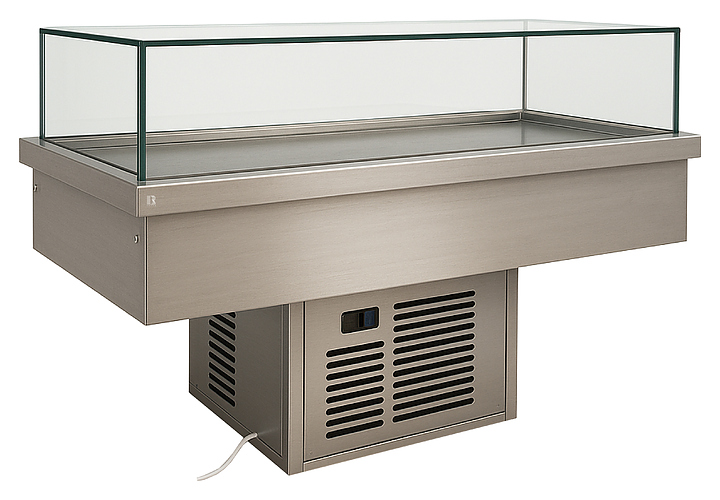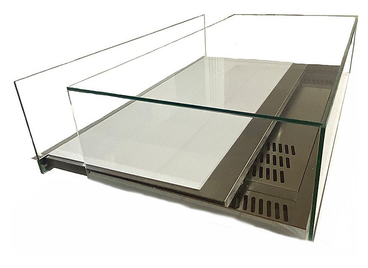 Встраиваемая кондитерская витрина Braum VMD-1 используется на предприятиях общественного питания и торговли для демонстрации, охлаждения и кратковременного хранения напитков, тортов, пирожных и других кондитерских изделий и гастрономических товаров. Высота и длина стекла проектируется под заказ. Модель оснащена выдвижной панелью, индикатором отображения температуры, испарителем, компрессором с кожухом в сборе, кнопками включения / выключения компрессора и подсветкой. Короб и выдвижная панель выполнены из нержавеющей стали толщиной 0,8 мм. Особенности: