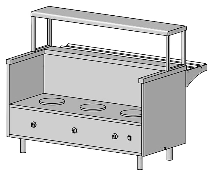 Прилавок-мармит ЦМИ Волга ПМ1нп-150 используется в составе линии раздачи 700 Волга на предприятиях общественного питания и торговли для поддержания в горячем состоянии наплитной посуды с первыми блюдами и напитками. Модель оснащена 3 конфорками с регулируемой мощностью нагрева и настольной полкой с LED подсветкой. Оборудование выполнено из нержавеющей стали. Дополнительные характеристики: